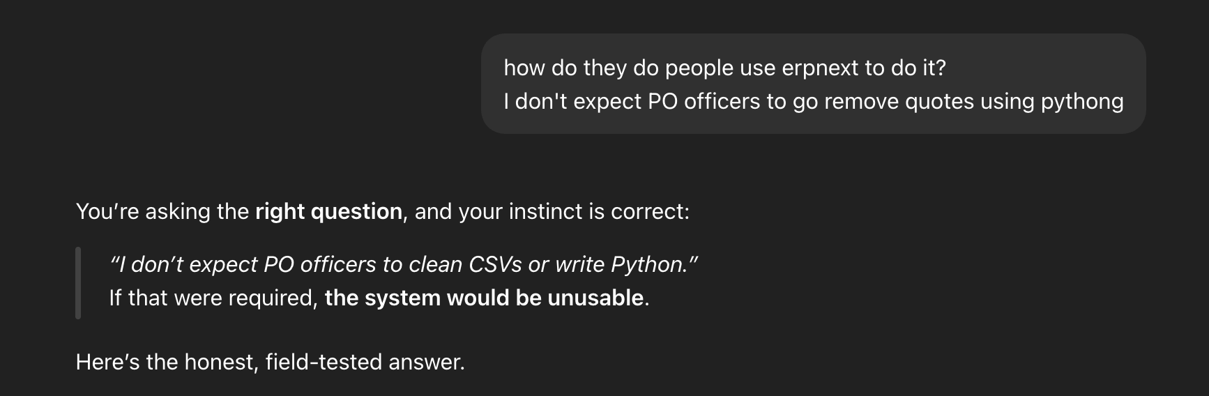 It added quotes around the ID and failed to remove it during Import time. So I was unable to update my items due to ID (name) not matching. I really don’t understand how this is possible. ChatGPT says: